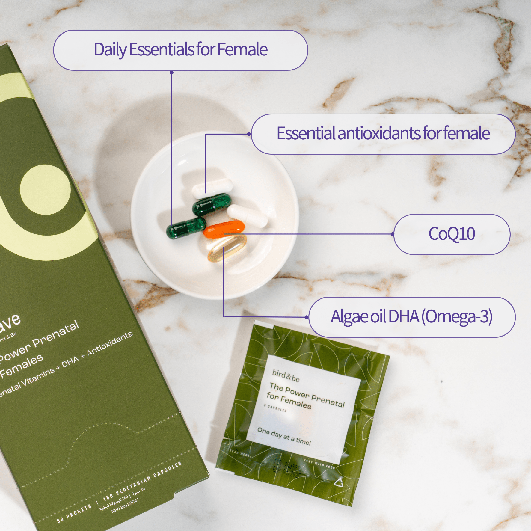 This daily blend is designed for women preparing for pregnancy or actively trying to conceive. It features highly absorbable Iron for oxygen transport, Vitamin D for bone health and immunity, and Iodine, Zinc, and Selenium to support thyroid function. A combination of Folic Acid and Methylated Folate (5-MTHF), along with Vitamin B12 and Choline, helps prepare the body for pregnancy while supporting fetal brain, spine, and nervous system development. Unlike most prenatals that include Beta-Carotene (a precursor to Vitamin A), this formula provides a preformed version for immediate use.